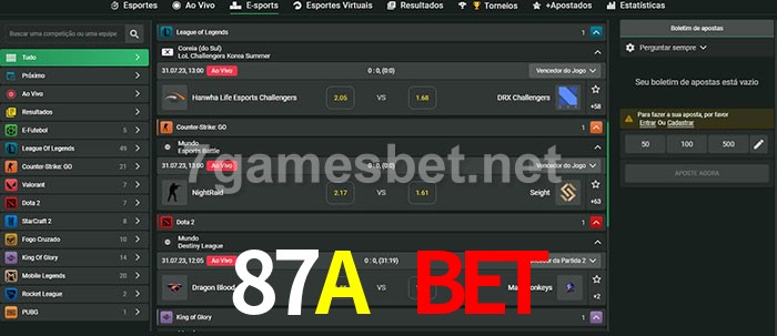O 87A Bet oferece uma grande seleção de opções de apostas em e-sports com probabilidades competitivas